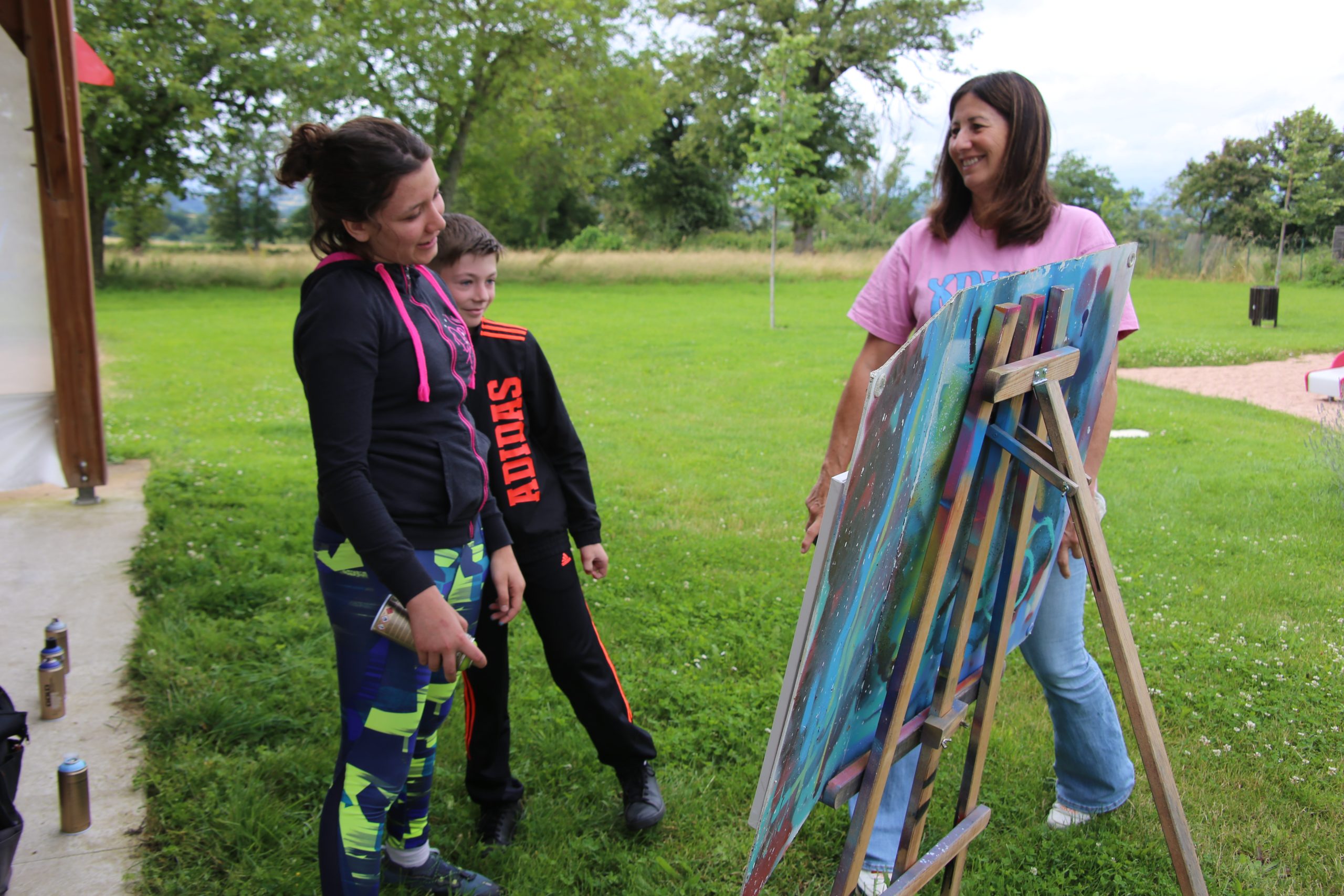 La météo encore une fois capricieuse a empêché d’œuvrer directement sur les parois du transformateur, mais l’atelier d’initiation au « street art » a été maintenu. Nos artistes en herbe, coachés par des graffeurs chevronnés, ont découvert et expérimenté la diversité des styles graphiques, puis se sont essayés à la peinture à la bombe. Ensemble, ils ont co-réalisé une première toile avec un mélo-graphique de leurs prénoms, puis une seconde sur le thème de la nature et des oiseaux ayant inspiré la fresque du transformateur. Bravo à nos artistes expérimentés et à la relève locale !