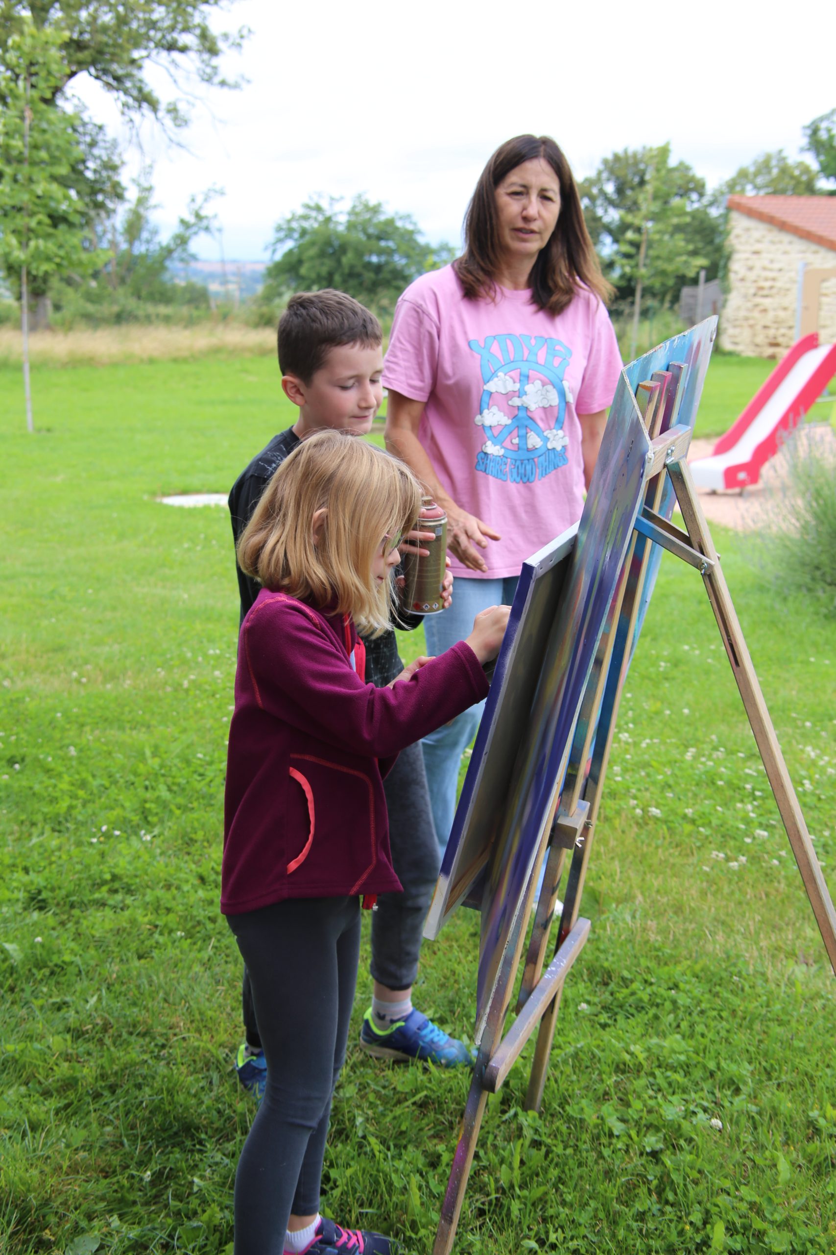 Cette dernière a embelli avec élégance et originalité le poids public communal et c’est dans le cadre de la réalisation d’une nouvelle fresque sur un transformateur du bourg, qu’il a été décidé d’associer les enfants volontaires à cette création artistique.