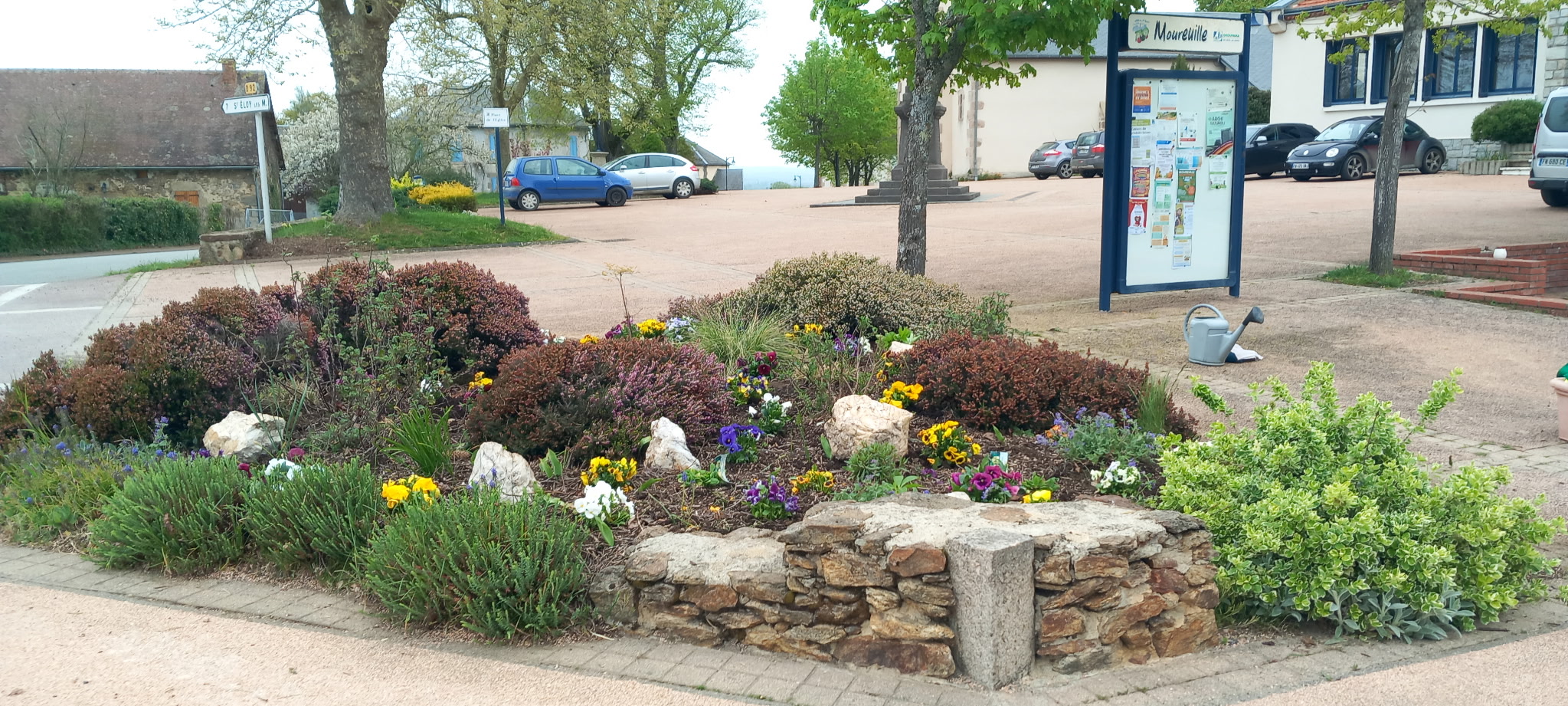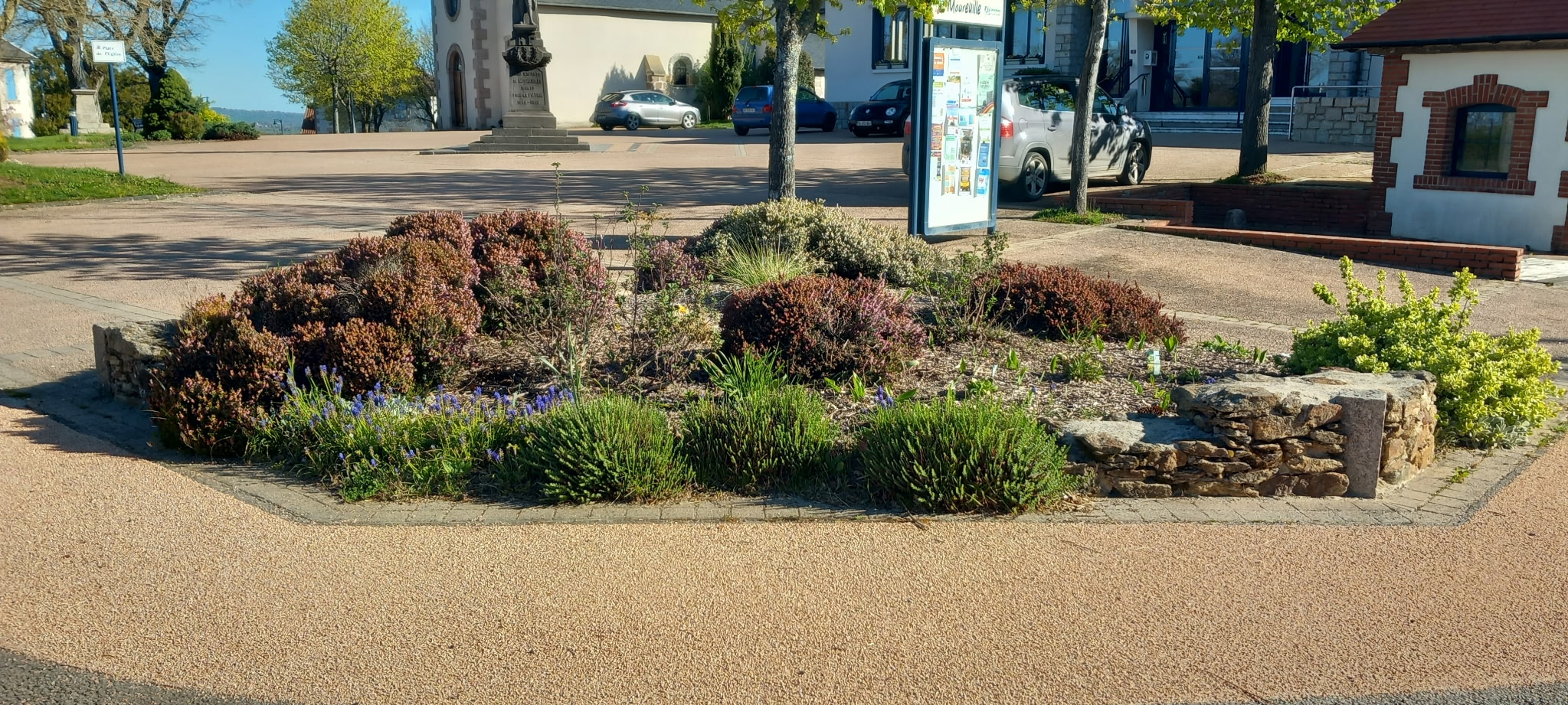 Dans le même esprit d’amélioration et de sécurisation des espaces publics, les cailloux qui étaient éparpillés sur la place de la commune, ayant occasionné des désagréments pour certains conducteurs et pouvant également représenter un risque pour les piétons, notamment en période nocturne, ont été regroupés et intégrés au parterre.