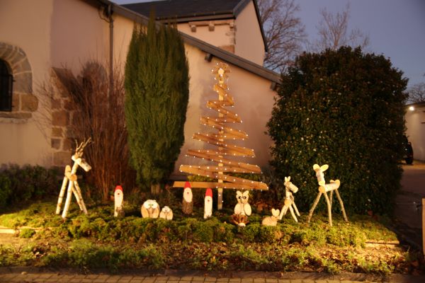 Cette saison 2023 ne devait pas être en reste, puisque de nouvelles décorations été à découvrir cette année encore, mettant plus particulièrement en valeur la place de l’église. En effet, l’ancien poids public, coiffé d’une toiture neuve, s’est vu orné de stalactites lumineux et le décor du fronton de la mairie a été remplacé. Enfin, c’est dans un tout autre style que d’étranges animaux ou autres lutins ont pris place autour d’un sapin de bois, formant un petit village de Noël artisanal à côté de l’église. C’est un habitant de la commune, Jacques LARVIN, qui a donné de son temps et de son savoir-faire pour créer ces très sympathiques personnages, applaudis chaleureusement par le public, lors de leur mise en lumière. Un très beau moment, où la magie de Noël semblait embraser le bourg et venait se refléter dans les yeux des petits et des grands.