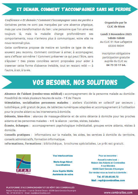L’objectif est de soulager l’aidant afin de prévenir l’épuisement physique et moral qui survient très fréquemment face à la charge de travail et aux responsabilités engendrées par l’accompagnement quotidien d’une personne atteinte de ce type de pathologie. https://www.combrailles.com/sante/pfar