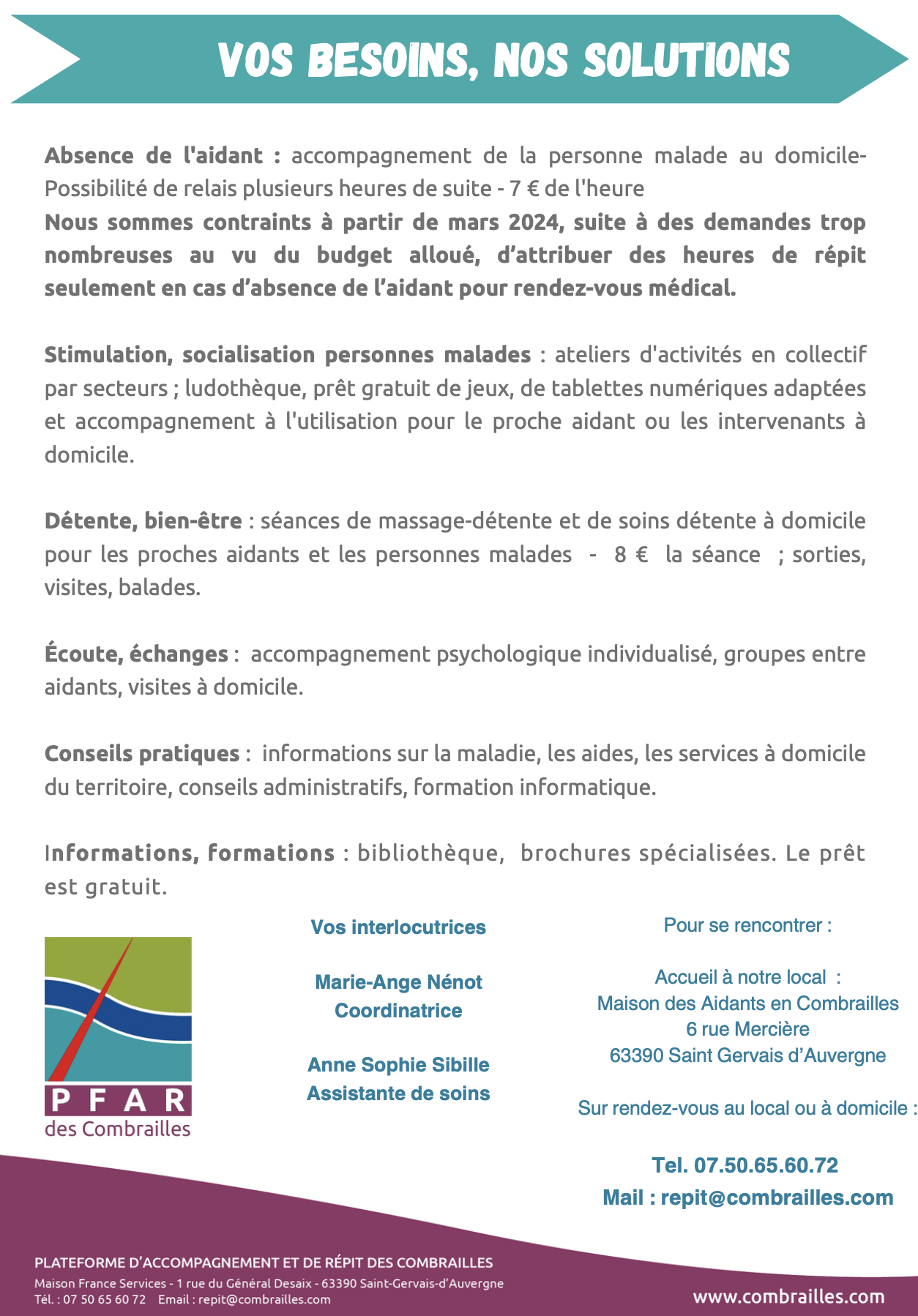 L’objectif est de soulager l’aidant afin de prévenir l’épuisement physique et moral qui survient très fréquemment face à la charge de travail et aux responsabilités engendrées par l’accompagnement quotidien d’une personne atteinte de ce type de pathologie. https://www.combrailles.com/sante/pfar