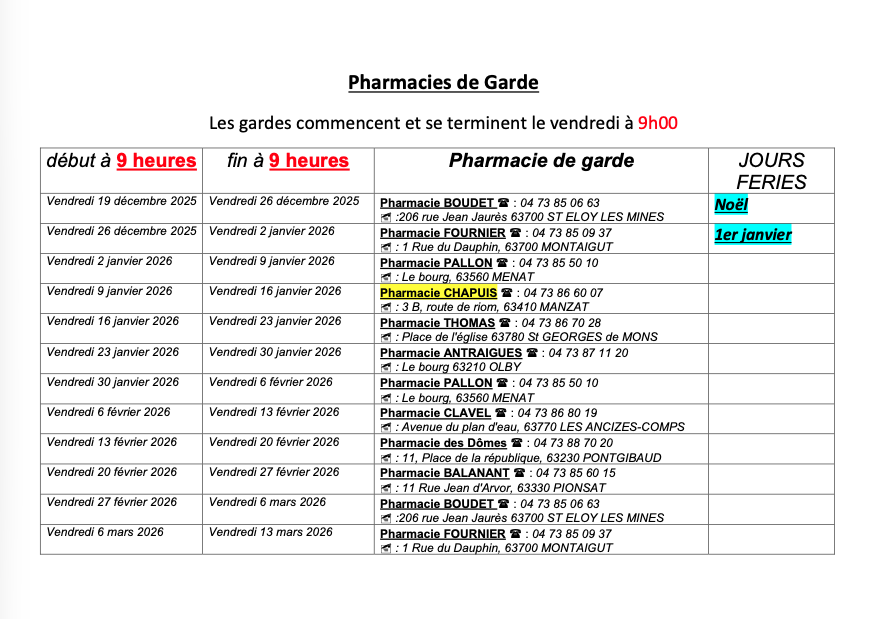 Les pharmacies BOUDET CHOLET, PALLON, BALANANT et FOURNIER se sont regroupées avec les pharmacies du secteur sud des Combrailles (Saint-Gervais-d’Auvergne, Les Ancizes-Comps, Saint-Georges-de-Mons, Pontgibaud, Manzat et Olby) afin de couvrir l’ensemble du territoire. Dorénavant, onze pharmacies assurent à tour de rôle des semaines de garde du vendredi 19h au vendredi suivant 9h. Si le vendredi est férié, la pharmacie commence sa garde à 9h. Vous pouvez cliquer sur le lien ci dessous pour accéder au calendrier des semaines de garde.