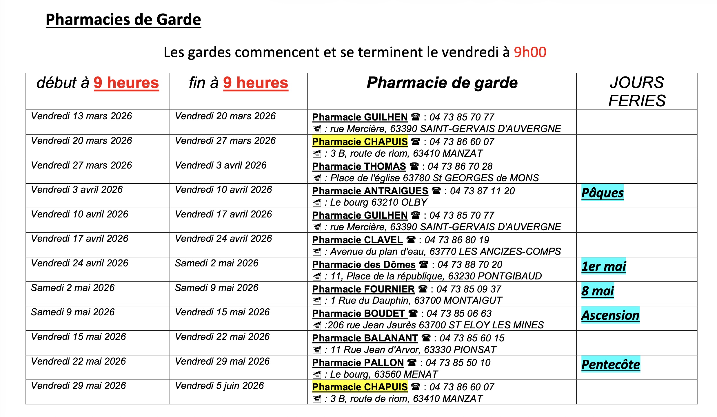Les pharmacies BOUDET CHOLET, PALLON, BALANANT et FOURNIER se sont regroupées avec les pharmacies du secteur sud des Combrailles (Montaigut, Menat, Manzat, St Georges de Mons, Olby, Les Ancizes-Comps, Pontgibaud, Pionsat) afin de couvrir l’ensemble du territoire. Dorénavant, elles assurent à tour de rôle des semaines de garde du vendredi 9h au vendredi suivant 9h. Si le vendredi est férié, la pharmacie commence sa garde à 9h. Vous pouvez cliquer sur le lien ci dessous pour accéder au calendrier des semaines de garde.