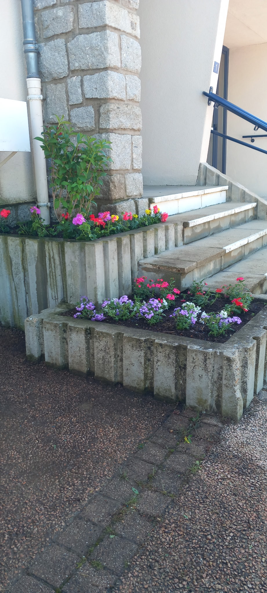 Un arbuste devenu inadapté a été retiré et remplacé par un weigelia, mieux adapté à son environnement. Cette intervention améliore également la visibilité de la boîte aux lettres. Les jardinières ont été complétées de fleurs en attendant la plantation de vivaces à l’automne et au printemps prochain, permettant à terme un entretien plus durable et moins gourmand en eau.